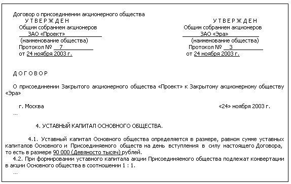 ЗАО «Проект» и ЗАО «Эра» 24 ноября 2003 года заключили договор о присоединении. Уставный капитал «Проекта» (основного общества) равен 70 000 руб., а «Эры» (присоединяемого общества) – 20 000 руб. Образованный в результате присоединения уставный капитал «Проекта» составил 90 000 руб. (70 000 + 20 000). В договоре о присоединении была сделана такая запись: