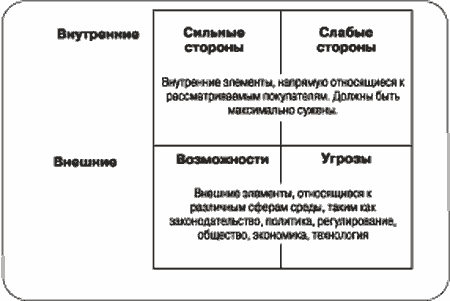 Любое сегментирование начинается со всестороннего изучения рыночной ситуации, в которой работает компания, и оценки типов возможностей и угроз, с которыми она может столкнуться. Отправной точкой для подобного обзора служит SWOT-анализ, один из самых распространенных видов анализа в маркетинге. Проще говоря, SWOT-анализ позволяет выявить и структурировать сильные и слабые стороны фирмы, а также потенциальные возможности и угрозы. Достигается это за счет того, что менеджеры должны сравнивать внутренние силы и слабости своей компании с возможностями, которые дает им рынок. Исходя из качества соответствия делается вывод о том, в каком направлении организация должна развивать свой бизнес и в конечном итоге определяется распределение ресурсов по сегментам.