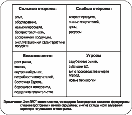 Простейшая форма представления результатов SWOT-анализа приведена на рис. А3.1: перечисляются сильные и слабые стороны, возможности и угрозы. Благодаря своей концептуальной простоте SWOT стал легко применимым для менеджеров и столь же подверженным неправильному применению. Для его проведения не требуются ни обширные базы данных, ни формальная подготовка. Любой, кто хоть немного знаком с компанией и имеет представление о рынке, может составить простой SWOT. С другой стороны, присущая анализу простота может привести к поспешным и бессмысленным выводам, полным таких неопределенных и двусмысленных понятий, как « эксплуатационная характеристика продукта», «современное оборудование», «цены». Вдобавок, пользователи иногда забывают об объективности и полагаются на устаревшую или ненадежную информацию.