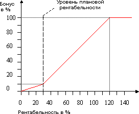Для профит-центров вводится плановая рентабельность равная средней рентабельности компании, например, 30%. ПЦ, имеющий рентабельность ниже плановой, получает бонус в пропорции 1/3 (30% рентабельности дает бонус 10%, 15% рентабельности дает бонус 5%). ПЦ, показывающий рентабельность выше плановой, получает бонус в алгебраической пропорции, за минусом 20% (40% рентабельности дает бонус 20%, 60% рентабельности дает бонус 40%).