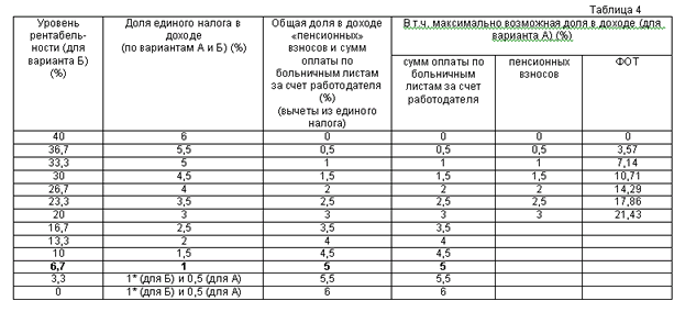 Если ООО «Витязь» запланирует рентабельность на уровне 15% и общую долю «пенсионных» взносов и пособий в доходах в размере 5% от доходов (максимально возможная доля «пенсионных» взносов 3%, а доля выплат по больничным листам - не менее 2%), то при варианте А доля единого налога в доходе составит 1% (6 - 5). Пользуясь таблицей 1 определяем, что при планируемом уровне рентабельности доля единого налога в доходе составит 2,25%. А это значит, что обществу выгоднее применять вариант А (1% < 2,25%).
