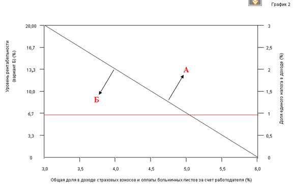 Из графика 2 и приведенных в табл. 4 данных можно сделать следующие выводы. Если налогоплательщик планирует вносить «пенсионные» взносы и выплачивать пособия по временной нетрудоспособности за свой счет в сумме, превышающей 5% от доходов, то в любом случае ему выгоднее применять вариант А. Ведь для варианта Б законодательством установлен минимальный налог в размере 1% от дохода и его придется уплачивать во всех случаях, когда рентабельность будет ниже 6,7%.