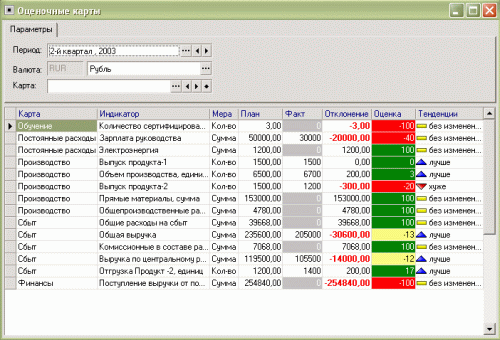 Контроль наиважнейших показателей деятельности осуществляется с помощью так называемых оценочных карт (Balanced Scoreсard). Основное предназначение оценочных карт — помочь оценить масштаб отклонений достигнутых результатов от ожидаемых. В рамках этого метода все отклонения делятся на благоприятные, допустимые и критические. Порядок отнесения отклонения к тому или иному классу настраивается самим предприятием, т.к. у фирм, относящихся к разным «весовым категориям» понятия о «потерях» абсолютно различны. Поскольку одна из главнейших проблем любого исполнительного менеджера — это цейтнот, оценочные карты позволяют сэкономить немалое количество времени, давая ему возможность для быстрой и адекватной оценки событий и, следовательно, для оперативного реагирования на эти события. Оценки отклонений, представленные на карте, окрашены в цвета светофора: благоприятные — в зеленый, допустимые — в желтый, критические — в красный. Соответственно, менеджеру хватает буквально одного взгляда для восприятия ситуации и выработки «руководства к действию». Кроме того, на карте присутствует и качественная оценка полученных показателей в сравнении с предыдущим периодом —«лучше», «хуже», «без изменений». Еще одним средством оценки событий, присутствующим в программном продукте «Контроллинг» являются датчики отклонений, отображаемые в виде спидометров и имеющие шкалу, разделенную на сектора —«благоприятный», «допустимый», «критический» (Рис.3).