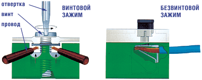 В первом случае провод с помощью винта зажимают между контактными пластинами. Такой способ крепления хорош для алюминиевых проводов: в процессе работы они могут нагреваться и с течением времени потихоньку деформироваться (как говорят специалисты, начинают течь). Тогда контакт ослабевает, искрит, греется. Но достаточно лишь подкрутить винт - и все в порядке. Медные провода можно подключать безвинтовым зажимом - специальной клеммой. Быстро, просто и надежно.