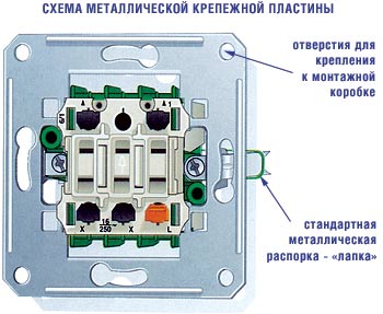 К примеру, в дачных домиках или в старых сталинских домах провода обычно закреплены снаружи, на стене, - это и есть открытая проводка. Для нее существуют специальные <накладные> выключатели. Сейчас в городских квартирах, как правило, провода убраны в стены. А в том месте, где устанавливают выключатели, долбится небольшая полость. Кстати, если раньше выключатели держались только за счет <лапок>, упирающихся в стену, то в последнее время появились металлические крепежные пластины с отверстиями: в полость стены помещается установочная коробочка, и уже к ней шурупами крепится выключатель.