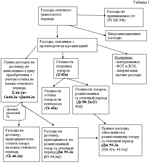 Общая упрощенная схема определения прямых расходов, уменьшающих налогооблагаемую базу по прибыли текущего периода, у торговой фирмы выглядит так (таблица 1):