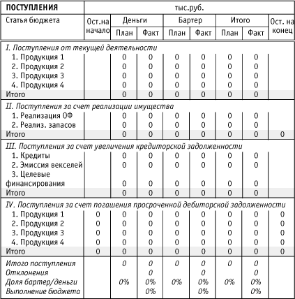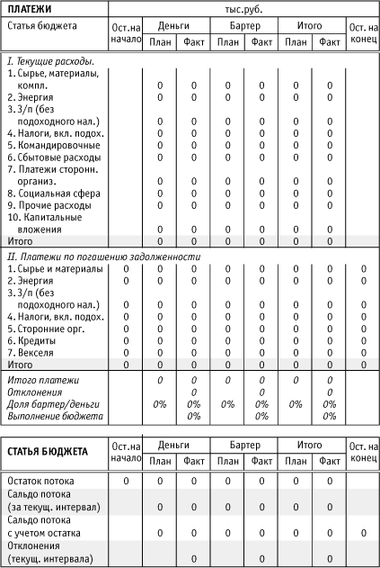 При построении прогнозного отчета о движении платежных средств компании необходимо отдельно сводить бездефицитное сальдо по денежным средствам и отдельно сводить бездефицитное сальдо по бартерным операциям. В случае дефицита по одному из видов платежных средств и профицита по другому необходимо заранее рассмотреть возможность и целесообразность "перекидки" различных видов платежных средств между собой.
