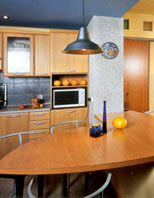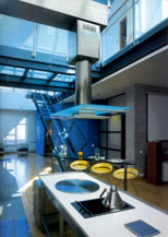 Главная задача верхнего освещения - поддерживать светлую атмосферу кухни в вечернеевремя. Помимо этого, если кухонная зона в квартире с открытой планировкой не имеетокна, верхний свет служит полной заменой дневного ориентирующего освещения. В такихкухнях с постоянно включёнными лампами сложно предугадать требуемое количествосвета. Как правило, точечных светильников либо недостаточно, либо их светчересчур назойлив. Из сложной ситуации можно выйти разными способами, создав,к примеру, иллюзию прорезанного в потолке окна. Для этого используют подвесныеконструкции, смоделированные из полупрозрачных, пропускающих свет материалов.При этом между перекрытием и плоскостью потолка размещают достаточно мощныеравномерно распределённые светильники. Лучше всего в такой ситуации применятьудлинённые линейные источники искусственного света. Если кухня расположенанепосредственно под крышей здания, лучшим решением является использованиеестественного света, нисходящего с потолка. В этом случае устраивают"фонари" различной конфигурации с применением специальных кровельных окон.