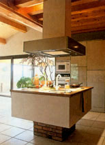 Современные кухни отличаются достаточно свободным подходом к планировке.Рабочий фронт необязательно должен быть вытянут вдоль стен, он можетрасполагаться, к примеру, посередине помещения. Таким способом может бытьсоздано достаточно много вариантов компоновки - от узкой высокой столешницыдля еды "на ходу" до вынесения в центр кухни всего оборудования. Подобнаяпланировка требует определённого подхода к освещению, поскольку иного местадля размещения светильников, кроме потолка, просто не остаётся.