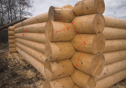 Возможно, это положение и является истинным, но только в том случае, когда дом или баню рубят для себя. Бригада мастеров на заказ вынуждена использовать каждое заготовленное бревно, в результате в сруб попадают кривостой (1), разнобой (2), прочие дефектные брёвна.