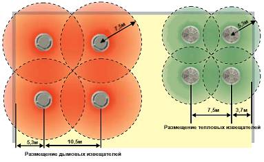 "Работа тепловых и дымовых датчиков зависит от конвекции, которая переносит горячий газ и дым от очага к датчику. Расположение и шаг установки этих датчиков должны основываться на необходимости ограничения времени, затраченного на это движение и при условии достаточной концентрации продуктов сгорания в месте установки датчика. Горячий газ и дым, в общем случае, будут концентрироваться в самых высоких частях помещения, поэтому именно там должны быть расположены тепловые и дымовые датчики.