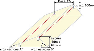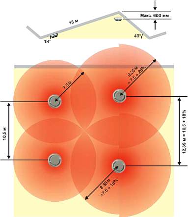 Если защищаемая область имеет наклонный потолок, то значение 5,3 м приведенное выше может быть увеличено на 1% для каждого градуса наклона до максимального увеличения на 25 %.