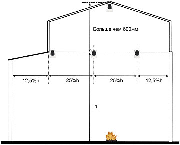 Из максимально допустимого расстояния от чувствительных элементов до потолка вытекает критерий наклонного перекрытия и обязательного размещения датчиков по коньку: пожарные детекторы должны быть размещены по каждому коньку за исключением случая, когда разница высоты между верхней частью и нижней частью перекрытия менее, чем: