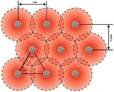 Кроме того, в случае помещениях больших размеров на практике используется более экономичная треугольная, шаг которой определяется так же исходя из радиуса защищаемой зоны (рис. 2).