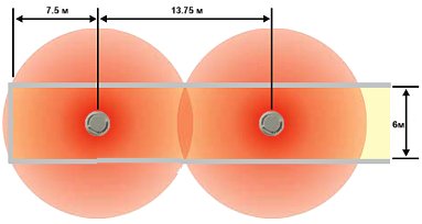 Линейные тепловые датчики должны устанавливаться таким образом, чтобы расстояние от любой точки защищаемого помещения в горизонтальной проекции до ближайшей чувствительной точки не превышало 5,3 м, т.е. контролируется полоса шириной 10,6 метров.