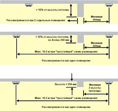 Там, где имеются балки или воздуховоды не больше, чем 250 мм по высоте, осветительная арматура или другие отдельные устройства, расположенные на потолке создают препятствия потоку дыма, датчики не должны быть установлены ближе к преграде чем ее двойная высота. Потолочные балки шириной более 150 мм и по высоте и более 10 % от высоты потолка должны рассматриваться как стены (рис. 7).