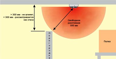 Если защищаемая зона разделена перегородками или стеллажами, верхний край которых расположен в пределах 300 мм от потолка, они должны рассматриваться как сплошные стены, которые поднимаются до потолка. Расположение датчика должно быть таким, чтобы имелось свободное пространство на расстоянии не менее 500 мм от него в нижней полусфере (рис. 8).