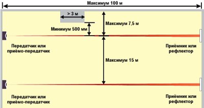 Линейные дымовые датчики должны устанавливаться таким образом, чтобы расстояние от любой точки защищаемого помещения в горизонтальной проекции до ближайшей точки оптического луча не должно превышать 7,5 метров, т.е. контролируется полоса шириной 15 метров (рис. 9).