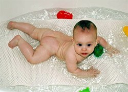 Мыть малыша лучше всего перед утренним десятичасовым кормлением, но можно это делать и перед любым другим. Нельзя устраивать ванну после кормления, потому что ребенку в это время положено спать. Вечером, в 6 или 10 часов, выкупать младенца может и вернувшийся с работы папа - как правило, отцам этот процесс доставляет огромное удовольствие. Когда новорожденный перейдет на трехразовое питание, ванну лучше устраивать перед обедом или перед ужином. Чтобы малыш не мучился от голода, можно дать ему апельсиновый сок. Подрастая, малютка перестанет засыпать сразу после вечернего кормления и сможет принимать ванну перед сном, что очень удобно, особенно если ужин бывает не очень поздно. Мыть карапуза нужно в теплом помещении, например в кухне. Перед началом купания нужно удостовериться, все ли необходимые вещи находятся под рукой. Воду в ванночку следует набрать заранее. Нагревать ее нужно до 35-40С, что примерно соответствует температуре тела. При наличии термометра это сделать легко, но можно обойтись и без него. Для этого необходимо коснуться воды локтем или запястьем - если чувствуется приятное тепло, значит, вода подходит для купания. Пока мама не приобретет навык поддерживать малыша в ванночке, не следует наливать слишком много воды. Чтобы тельце ребенка не скользило по поверхности ванночки, можно выстилать ее изнутри пеленкой. При купании необходимо поддерживать младенца так, чтобы его голова лежала на локтевом сгибе держащего, а пальцы этой же руки находились у него под мышкой. Сначала махровой салфеткой с мылом нужно вымыть малютке личико, потом головку. Причем голову нужно мыть мылом не чаще двух раз в неделю. Сполоснув и отжав салфетку, необходимо дважды обтереть голову от мыльной пены. Следует помнить, что если салфетка будет слишком влажной, мыльная вода может попасть в глаза ребенку и они начнут щипать. Этого можно избежать, если мыть малыша специальными детскими средствами, не раздражающими слизистую оболочку глаз. Далее с помощью салфетки или, что гораздо удобнее, рукой нужно намылить тельце, ручки и ножки новорожденного. Если после купания кожа малыша становится сухой, не нужно применять мыло чаще двух раз в неделю. Также не безопасно для ребенка принимать ванны с мыльной пеной, так как она может вызвать раздражение кожи. Многие родители не обнаруживают особой разницы между такими понятиями, как купание и мытье. Для них это одно и то же. На самом деле купать маленьких детей необходимо не только для того, чтобы они были чистыми. При правильно организованном купании малыш закаляется, получает двигательную нагрузку, а значит, лучше ест и спит, приобретает большое количество положительных эмоций. Кроме того, это прекрасный способ избежать многих инфекционных болезней и быть чистым. Многие родители закрывают дверь в ванную комнату, опасаясь, что холодный воздух может повредить младенцу. На самом же деле этот воздух ему не повредит, а вот закрытые двери могут действительно не лучшим образом сказаться на его состоянии. Для организма человека резкое изменение влажности воздуха неестественно. А потому, когда родители несут ребенка из распаренной ванной в сухой воздух комнаты, то могут возникнуть проблемы, например с ушами.