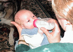 Если женщина не может кормить грудью, бутылочку малышу впервые дают через двенадцать часов после рождения или даже раньше, если понятно, что он уже проголодался. Многие молодые мамы волнуются из-за того, что в первые несколько дней ребенок пьет очень мало молока. На самом деле, в этом отсутствии аппетита нет ничего необычного, потому что пищеварительной системе новорожденного требуется время, чтобы привыкнуть к новым условиям. Бутылочку нужно встряхнуть перед тем, как дать малышу, чтобы разболтать скопившийся сверху слой сливок. Но если смесь приготовлена из гомогенизированного молока, в этом нет необходимости. Многие родители считают, что ребенку нужно давать только подогретую смесь, ведь тогда она будет больше похожа на молоко матери. Специалисты же в последнее время пришли к выводу, что младенцу безразлично, теплую или холодную жидкость он сосет из бутылочки.