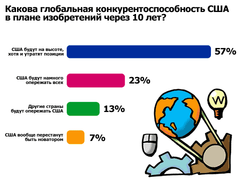 Когда же у американцев спросили, о конкурентоспособности Соединенных Штатов в плане изобретений через 10 лет, 57% взрослых и 55% подростков сообщили, что Америка останется на высоте, но уступит лидерство другим странам. Вот как выглядит схема.