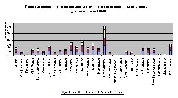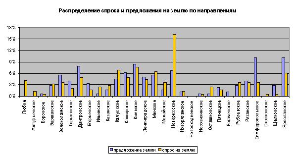 Представленные выше данные несколько отличаются от количественной оценки заявок на покупку и продажу земли. Возможно, их можно рассматривать как перспективу направлений загородного строительства, где количественный спрос отдельных покупателей на данный момент не велик, но можно в ближайшем будущем ожидать его роста. Например: Ленинградское шоссе утратило в последнее время свою привлекательность из-за загруженности трассы и вытекающих из этого экологических проблем, но оно обладает многочисленными водоемами, расположенными в глубине Химкинского и Солнечногорского районов, а также характеризуется близостью аэропорта Шереметьево. Это и есть недооцененная стоимость земли, стимулирующая интерес инвесторов.