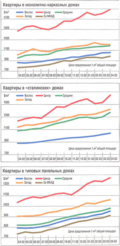 Риэлтерам сегодня сложно удовлетворить заявки и на квартиры, расположенные в сталинских домах и дореволюционной постройки в таких районах, как Университетский, Арбат, Сокол. Несколько лет назад риэлтеры полагали, что новые монолитные дома составят такому жилью серьезную конкуренцию, но этого не произошло. Объясняется это очень просто. В столице сохраняется прослойка покупателей, которая не может позволить себе приобрести новую квартиру в элитном доме, но хочет жить в престижном районе. Цены подобных предложений высоки, однако покупателям удается сэкономить за счет небольшой площади квартир. В конце I квартала 2003 года была продана трехкомнатная квартира площадью около 100 кв. м в сталинском доме на Фрунзенской набережной за $310 тыс. Но это скорее исключение из правил, средняя цена продаж по городу в сталинских домах в апреле составила $1371 за кв. м – это на 5,23% больше, чем в марте (см. таблицу).
