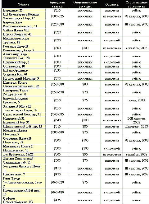 В первом полугодии 2003 г. готовые к въезду офисы сдавались в аренду лишь в нескольких бизнес центрах города. А в основной массе на рынке присутствуют лишь предложения по строящимся зданиям класса "А", реже класса "В" различной ценовой категории. В первом полугодии шел их активный процесс сдачи в аренду.