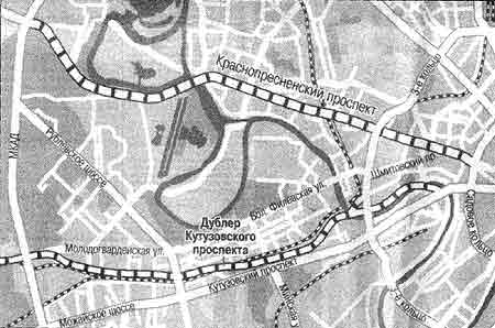 - Характерная особенность предстоящей стройки состоит в том, что как магистраль Краснопресненский проспект (а это Звенигородское шоссе, улицы Нижние Мневники, Народного Ополчения, проспект Маршала Жукова) не имеет выхода на кольцевую автодорогу. Здесь отсутствуют транспортные связи районов Троице-Лыково и Крылатское.