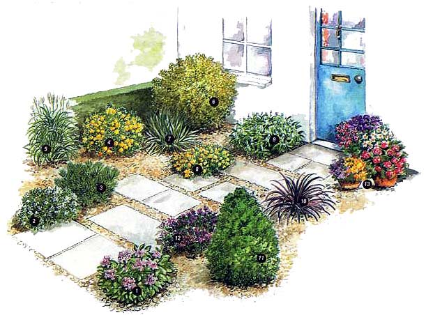 Мощеные площадки не должны быть обширными, лишенными растительности пространствами, выложенными кирпичом, камнями или залитыми бетоном. На этой иллюстрации сочетание каменных плит, гравия и растительности образует красивый небольшой садик перед домом, создание которого потребовало незначительных вложений. Кроме того, за ним несложно ухаживать.