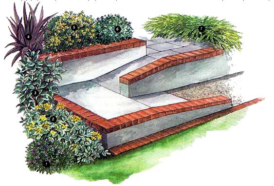 Вместо лестницы в саду можно построить пандус, который значительно облегчит перемещение между разными уровнями участка. Плошадка посередине подъема облегчает поворот.