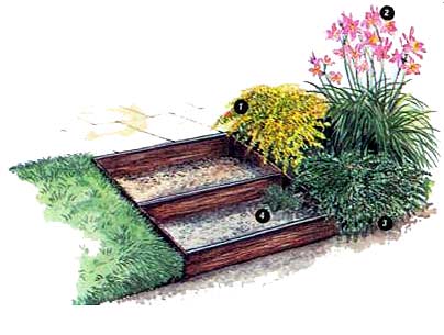 Для того чтобы подняться на невысокий склон, бывает достаточно простой лестницы из деревянного каркаса, уложенного на гравий. Такую лестницу можно изготовить из тонких досок, сбитых гвоздями или соединенных скрытыми от глаз болтами, или из более толстых и тяжелых брусков, для прочности усиленных стойками. Стойки можно вывести наружу, придав конструкции более непринужденный вид.