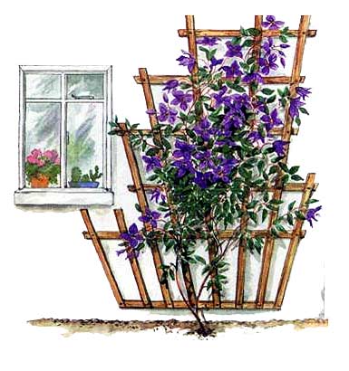 Решетку нужной формы и размера можно сделать своими руками, например из деревянных реек. Горизонтальные рейки крепят к стене, а вертикальные прибивают к ним гвоздями или привинчивают шурупами. Решетка справа служит опорой для клематиса сорта "President".
