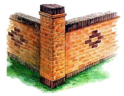 Гладкие кирпичные стены можно украсить различными способами. На этом рисунке для отделки верхнего края, гидроизолирующего слоя и декоративных вставок использован кирпич контрастного цвета.
