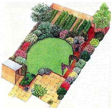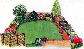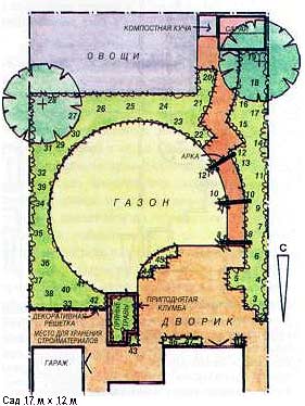 В заросшем деревенском саду можно с удовольствием копаться или отдыхать, но такой сад не всегда отвечает потребностям современной семьи. В этой главе предлагается вариант планировки большего по размерам, чем предыдущий, участка, который предусматривает создание сада в пейзажном стиле, но при этом учитывает чисто практические требования.К удобному дворику примыкает центральный газон, на котором достаточно места для детских игр и приема гостей. Дорожка из кирпича, ведущая от дворика к небольшому огороду, где также есть место для маленького сарая и компостной кучи, повторяет изогнутую линию газона. Огород скрывают от взгляда декоративные кустарники, а также арки над дорожкой, увитые вьющимися растениями.