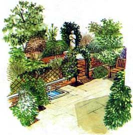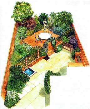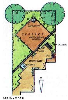 Даже если садик в городе небольшой и узкий, его можно превратить в прекрасное место для отдыха и приема гостей. На предлагаемой схеме показано, как можно, отказавшись от газона, бесполезного большую часть года, и разместив мощеную площадку под углом к дому, использовать небольшие размеры участка настолько эффективно, что остается место для посадки необычных растений. Деревья, высаженные в дальнем конце сада, позволяют придать объем небольшому замкнутому пространству сада.