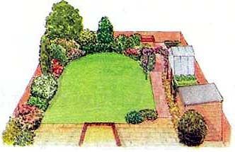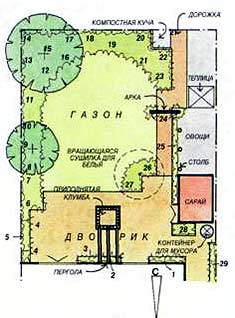 Многие родители, у которых есть маленькие дети, в какой-то момент сталкиваются с тем, что в саду не хватает места, чтобы удовлетворить возросшие потребности семьи. Предлагаемая схема планировки типичного современного участка показывает, как можно достигнуть компромисса, разместив в саду игровую площадку, бордюр из цветов, сарайчик для инвентаря и огород, сохранив в то же время привлекательный внешний вид участка.