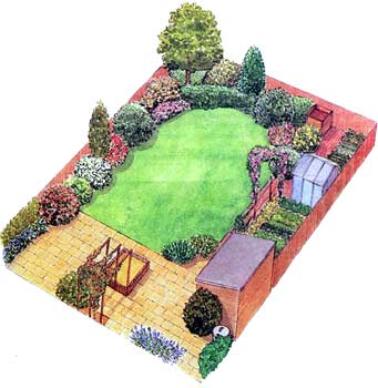 Несмотря на то, что часть участка занимают мощеная площадка и газон, предназначенные для детских игр и отдыха, не забыты и другие потребности. Например, есть небольшой огород с маленькой теплицей, сарай для хранения велосипедов и садовой мебели, выделено место для таких необходимых вещей, как вращающаяся сушилка для белья и контейнер для мусора.Узкая дорожка, вдоль которой установлены столбы, поддерживающие вьющиеся растения, отделяет огород, проходит под аркой и доходит до небольшой компостной кучи в дальнем углу сада. Просторный дворик разделен красивой приподнятой клумбой, связанной со стеной дома простой перголой. А мощение продолжается дальше, за угол дома — к хозяйственной зоне и запасному выходу.