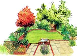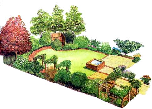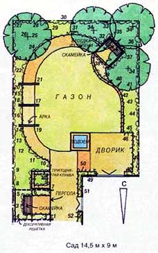 Здесь представлен вариант планировки декоративного сада. Поверхность участка имеет легкий уклон от дома, что позволяет обойтись без резких перепадов уровней и не делать ступеньки. Возле дома для удобства устроены две раздельные площадки для отдыха — перед распашными дверями гостиной и возле задней двери дома, причем одна из них большую часть дня находится на солнце, а другая слегка затенена перголой и декоративными решетками.