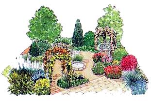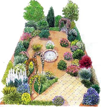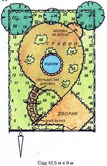 Маленький дворик перед стеклянными дверями гостиной удобен для отдыха. Непосредственно из дворика или в обход по маленькой прерывистой дорожке, проложенной под увитыми розами арками, можно попасть на покрытую гравием центральную площадку округлой формы. Площадка окружена довольно плотными посадками, контрастирующими с гравием. В некоторых местах растения высажены на площадке прямо в гравии. Это позволяет избежать впечатления заросшего сада и ощущения замкнутого пространства.