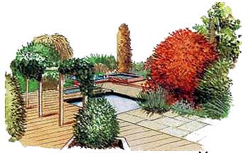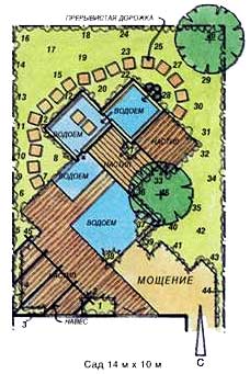 Несмотря на то, что эта эффектная водная композиция представлена здесь как самостоятельный проект планировки сада, ее легко можно воплотить в какой-либо части более просторного участка.