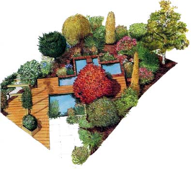 Водоем может быть большим или маленьким, строгой геометрической или произвольной формы, тем не менее в саду ему зачастую отводят второстепенную роль по сравнению с другими элементами планировки. В данном случае, напротив, центральную часть маленького садика занимают два прямоугольных приподнятых прудика, соединенных водопадами с большим водоемом, расположенным на переднем плане покрытой деревянным настилом зоны отдыха. Естественный уклон почвы от дальнего конца сада к дому подчеркивает перепад уровней от одного бассейна к другому.