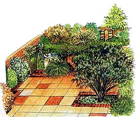 Чередование соединенных впритык квадратных бетонных плит коричневого и бежевого цвета с шероховатой поверхностью придает своеобразную привлекательность дворику, который в противном случае выглядел бы очень простым. Для окантовки дворика использован кирпич теплых оттенков красного цвета, из такого же кирпича сделаны вставки между плитами мощения. Этот же кирпич уложен «елочкой» в дорожку, которая берет начало от дворика, затем проходит под перголой и ведет вглубь сада, к зоне отдыха, расположенной в самом дальнем углу. Там она соединяется с площадкой, покрытой гравием. Через эту площадку к увитой зеленью беседке ведет прерывистая дорожка, выполненная из хорошо обработанных консервантом спилов бревен из древесины мягких пород.
