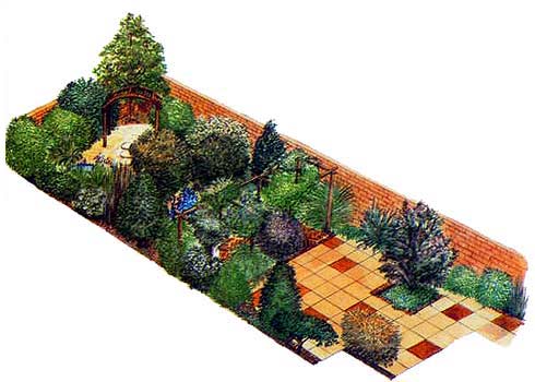 Узкие, вытянутые сады представляют для проектировщика довольно сложную задачу, потому что в них зачастую бывает трудно разместить все нужные сооружения и в то же время избежать «эффекта коридора», который такая форма сада неизбежно вызывает, особенно если участок окружен высокими стенами или забором.