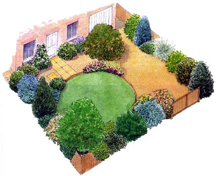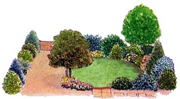 Абсолютно круглый газон с четко очерченным краем, окантованным кирпичом, создает великолепный контраст с не имеющим четких границ гравийным покрытием, а густые насаждения изогнутого бордюра подчеркивают особенности обоих элементов.