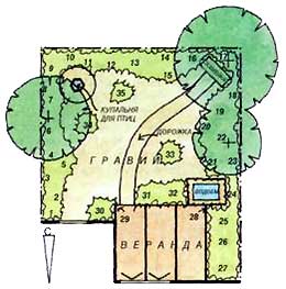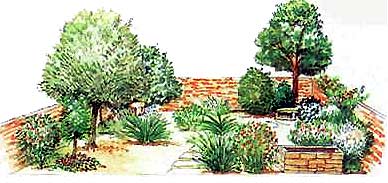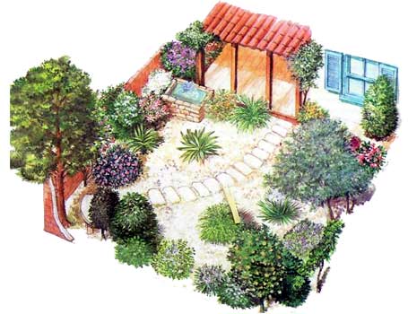 Учитывая необходимость свести уход за садом к минимуму, основное растительное обрамление состоит из кустарников и лиан, которые почти не требуют ухода, за исключением ежегодной подрезки, но при этом украшают сад круглый год. В таком маленьком пространстве необходимо подумать и над розмещением деревьев. Здесь их всего три, но они образуют прекрасно сбалансированную группу и предоставляют место для отдыха в тени в жаркий день.В покрытой гравием центральной части сада -несколько невысоких или медленно растущих растений, которые способны успешно развиваться в таком сухом, солнечном месте и имеют эффектный внешний вид.