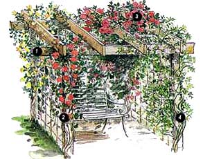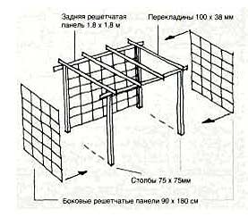 Эта прямоугольная беседка из зелени является по существу простой перголой, сооруженной из досок, к которой с трех сторон добавлены стандартные решетчатые панели.
