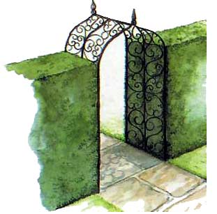 Многие предметы для сада изготавливают из кованого железа. В данном случае изящная кованая стрельчатая арка оформляет проход в стриженой живой изгороди из тиса.