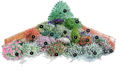 Земля, присыпанная к низкой кирпичной стене, образует основной почвенный уровень альпинария, устроенного на ровном участке. Это не только позволяет лучше рассмотреть растения, но и улучшает дренированность тяжелой почвы.