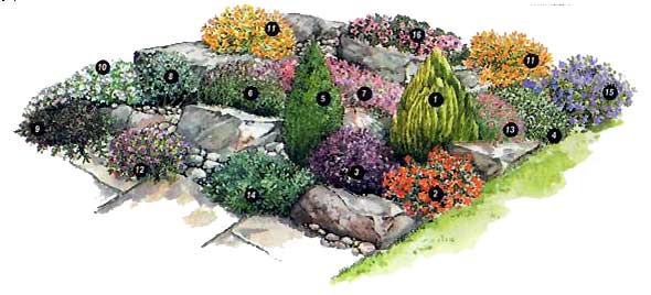 Небольшие плоские камни образуют как бы случайно вышедшие на поверхность почвы напластования. При укладке таких камней следуют тем же правилам, что и при строительстве альпинария на склоне. Несколько более высоких пирамидальных или колонновидных растений удачно контрастируют с камнями.